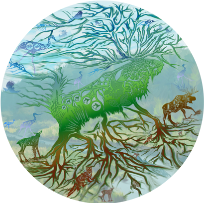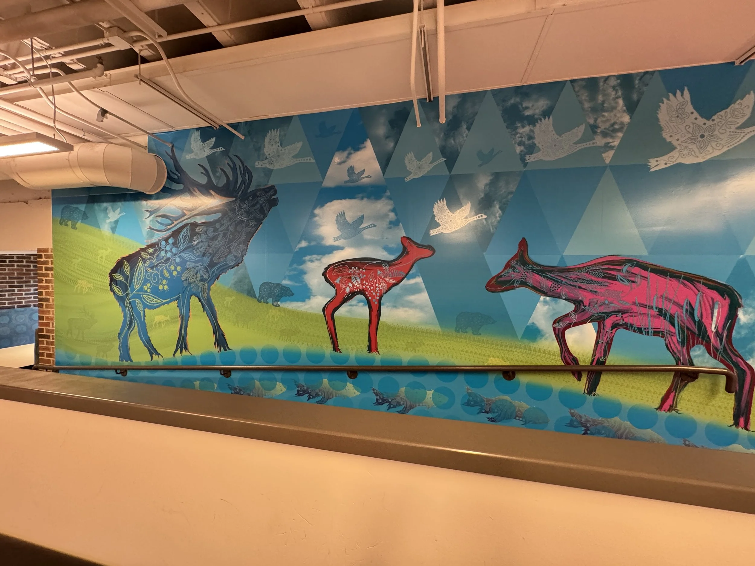 This piece is a part of the “all my relations” wakotawin series in which all is connected. This piece is featured at the entry to the Boreal Forest experience at the Calgary Zoo. Caribou is featured amongst other boreal forest animals in which colours and lines fade, flow, move, transform and merge to reflect interconnection and interdependence of the natural worlds winged, water and land animals with trees, roots, plants, food, water, and air. Transformation and transparent details create further narratives of habitat interdependence while featuring a unique stylized reference to the resurgence of traditional Indigenous art forms like quill, tufting and beadwork 2024
