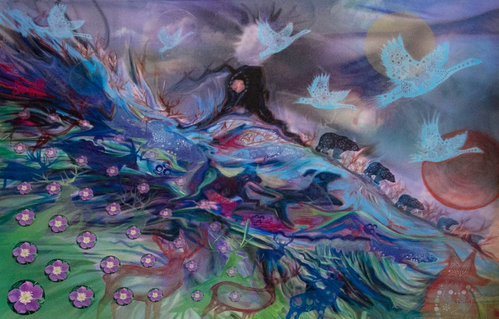 “Her pieces are a stunning mix of both digital and physical art, seamlessly blending the best of both worlds. Inspired by imagination, observations and her photographs, the artist creates layers of colour and textures using digital and physical art making tools. Figures and land become inseparable as each new layers add movement and story. The final works are briming with vibrancy and life.”